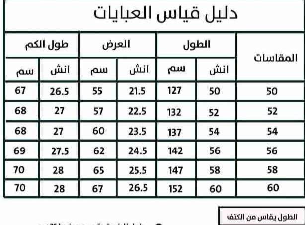 طول العباية يؤخذ من الكتف الى أسفل الكعبين من الامامالأمام)